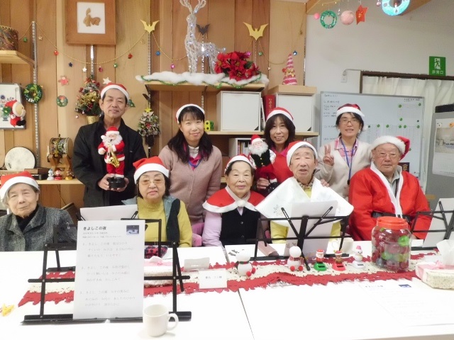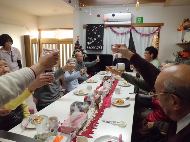 12月24日、25日、26日と「こころ」ではささやかながらの、クリスマスパーティを行いました。12月のはじめ頃より着々とクリスマスの飾りつけを、社長を先頭に取り組み、梅田の街に負けないくらい素敵な!?飾りつけになりました。クラッカーの音を合図にパーティは始まり、シャンパンで乾杯と行きたいところでしたが、スパークリンググレープジュースで乾杯!皆様にはパンケーキにデコレーションしお召し上がりいただきました。